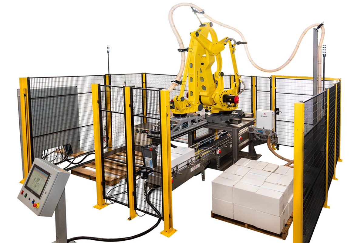 Description: Specifically designed for handling and stacking cartons or cases, often integrating with existing case packing lines. Can be robotic or conventional. Applications: Packaging lines for consumer goods, food products, electronics, etc., where products are already in cases.